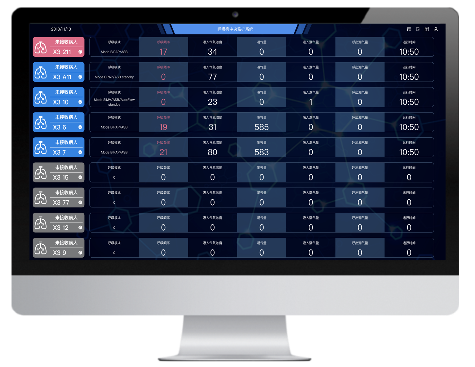 多臺不同品牌的有創(chuàng)呼吸機聯(lián)網(wǎng),并通過大屏實時集中呈現(xiàn)治療預(yù)設(shè)參數(shù)和監(jiān)測參數(shù),實現(xiàn)多臺集中監(jiān)測、集中管理和數(shù)據(jù)存儲。